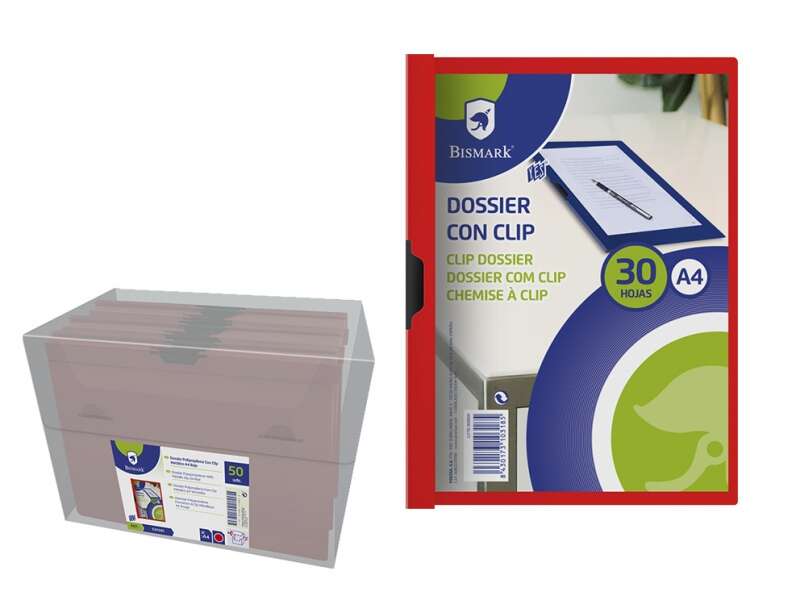 Bismark Dossier para 30 Hojas A4 con Clip Metalico Lateral – Polipropileno Transparente – Color Rojo