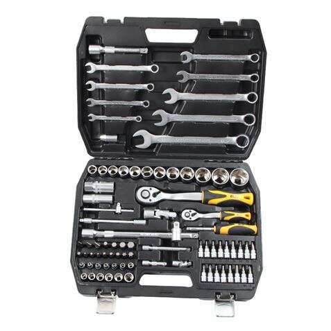 El conjunto de herramientas incluye una variedad de llaves combinadas, vasos de diferentes tamaños, cabezales con puntas de diferentes tipos, barras de extensión, mangos corredizos y destornilladores, adaptadores, chicharras con expulsor de vasos, entre otros. También se incluyen vasos de bujía, adaptadores de tres posiciones, una articulación universal y puntas de destornillador de diferentes tipos. Estas herramientas son ideales para realizar trabajos de reparación y mantenimiento en diferentes áreas.