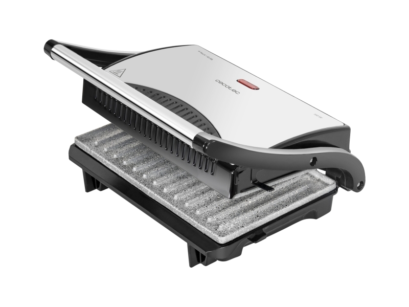 Cecotec Rock’nGrill Parrilla Electrica – 700W – Asa Tacto Frio – Revestimento de Piedra – Superficie 23×14.5cm – Hueco Recogecables – Base Antideslizante – Placa Superior Flotante – Color Negro y Plateado