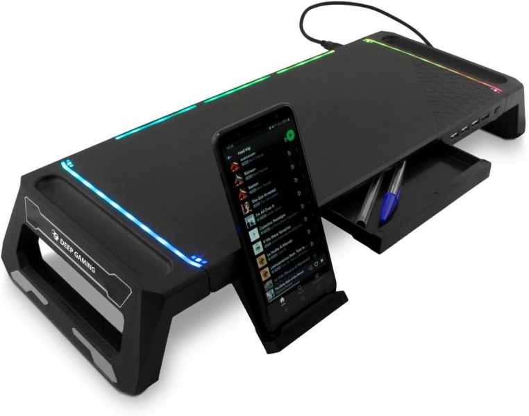 DeepGaming SN06 Soporte para Monitor – Ajustable 2 Alturas – Iluminacion RGB – 3 Puertos USB 2.0 + 1 Puerto USB 3.0 – Color Negro