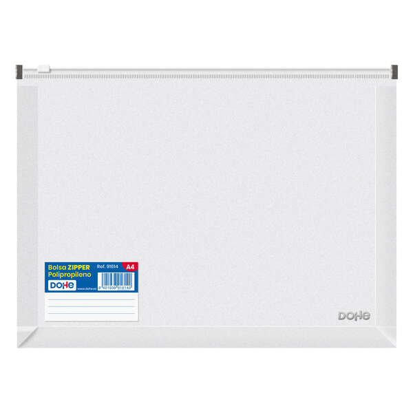 Bolsa Zipper apaisada fabricada en Polipropileno transparente de 180 micras, con apertura superior y cierre zip de plástico hermético color Blanco con refuerzo metálicos en los extremos. Lomo expansible de 30 mm, con etiqueta frontal.