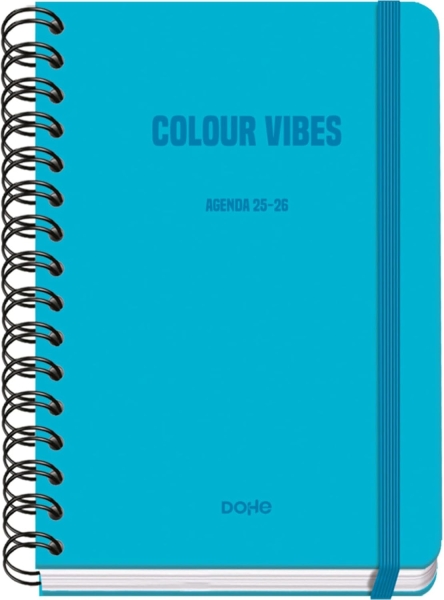 Dohe Colour Vibes Agenda Escolar 25/26 Espiral Wire’o A5 – Semana Vista – Papel 80g/m2 – 4 Hojas de Pegatinas – Cubierta de Carton Plastificado – Cierre con Goma Elastica – Color Azul Cyan