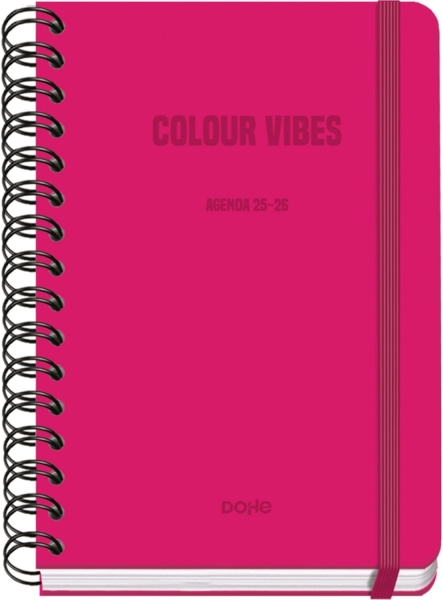 Dohe Colour Vibes Agenda escolar semana vista. Todos los días de la semana en dos hojas. La cubierta está fabricada en cartón forrado con papel impreso a todo color y plastificado mate con puntas redondeadas. Guardas impresas. Una agenda con wire’o metálico de color negro y cierre con goma elástica plana en color rosa.