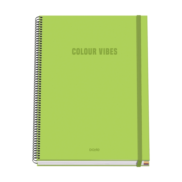 Dohe Colour Vives cuaderno en espiral de tapa dura tamaño A4. Cubierta en cartón forrado con papel impreso a todo color y plastificado. Guardas impresas. Cuaderno con espiral metálico color negro. Interior de 100 hojas en papel offset de 90 gramos microperforadas, con 4 taladros y cuadrícula de 5 mm con banda de color. Cierre con goma elastica. Con certificado FSC Mixto.