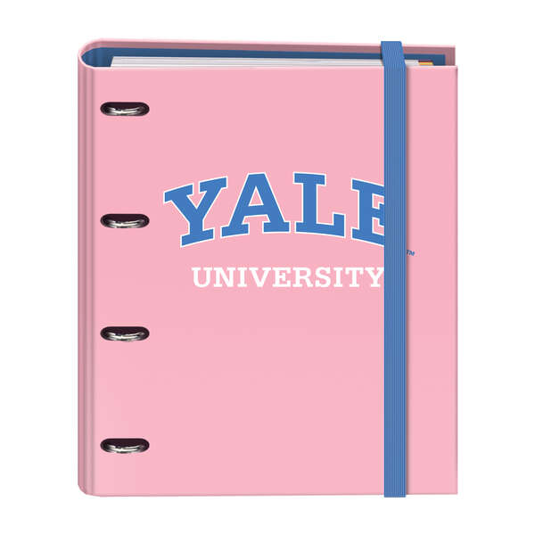 Cubierta en cartón forrado con papel impreso a todo color y plastificado brillo con guardas impresas. Mecanismo de 4 anillas mixtas niqueladas de 35 mm, con compresor de plástico y cierre de goma elástica ancha plana color Azul. Interior de 100 hojas en papel offset de 90 gramos con taladros y cuadrícula de 5 mm con banda de color. Incluye:
