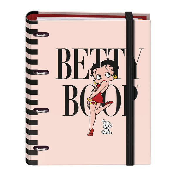 Cubierta en cartón forrado con papel impreso a todo color y plastificado brillo con guardas impresas. Mecanismo de 4 anillas mixtas niqueladas de 35 mm, con compresor de plástico y cierre de goma elástica ancha plana color ROJO. Interior de 100 hojas en papel offset de 90 gramos con taladros y cuadrícula de 5 mm con banda de color. Incluye: