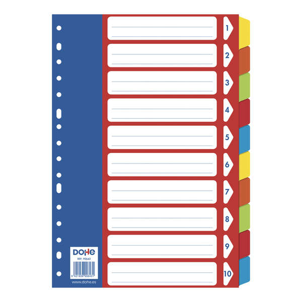 Separadores para archivadores y carpetas de anillas. Fabricados en cartulina de 180 gr con multitaladro de 16 perforaciones. Se sirven en bolsa autoadhesiva individual.
