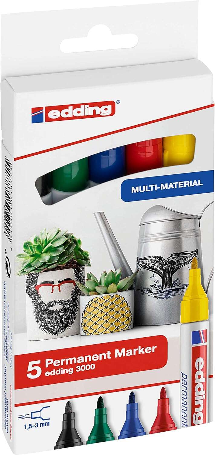 Edding 3000 Pack de 5 Rotuladores Permanentes – Punta Redonda de 1.5mm – Trazo entre 1.5 y 3mm – Recargable – Secado Rapido – Color Surtidos