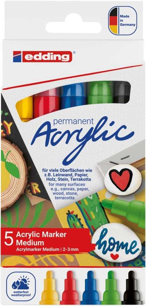 Edding 5100 Acrylic Pack de 5 Rotuladores Permanentes Acrilicos – Punta Redonda 2-3mm – Trazo Medio – Resistente a la Luz – Secado Rapido – Colores Surtidos