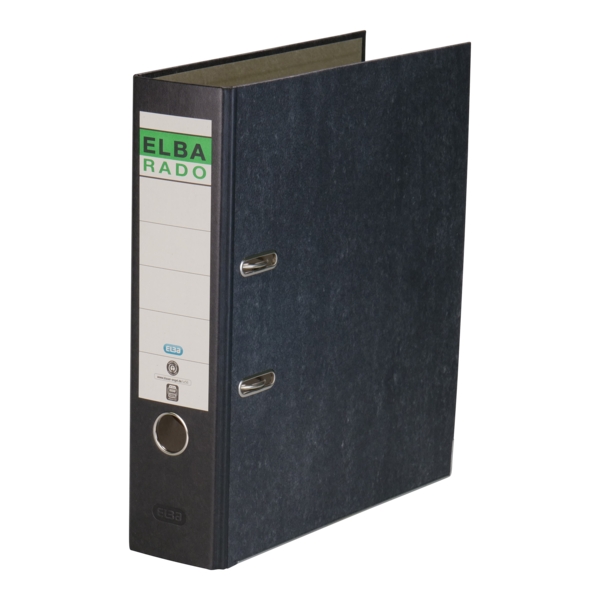 El archivador Elba Rado con palanca tiene un diseño clásico jaspeado, ideal para organizar documentos de tamaño A4. Con un lomo de 80mm, es resistente y duradero, perfecto para mantener tus papeles en orden de forma segura.