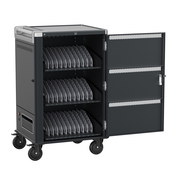 El carro de carga EW1701 le permite proteger, almacenar y cargar fácilmente hasta 36 dispositivos Tablets, Chromebook o portátiles con pantallas de hasta 15.6. Cuenta con un sistema de carga inteligente, estantes con ranuras para dispositivos flexibles y duraderas, un sistema de administración de cables/fuente de alimentación y, lo mejor de todo, está completamente ensamblado para una implementación rápida. Además, cuenta con espacios numerados para dispositivos y sus correspondientes espacios para suministro de energía para optimizar la organización. El carro también cuenta con puertas ventiladas con un mecanismo de bloqueo con llave de 3 puntos y la opción de agregar su propio candado para mayor seguridad.