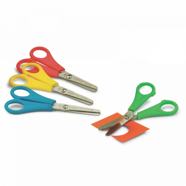 Tijeras escolares de acero inoxidable, empuñadura de plástico y punta roma, 13 cm. largo.