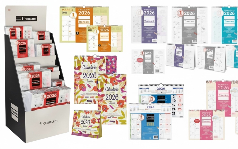Este expositor de pie, fabricado en cartón resistente, está diseñado para la exhibición ordenada y atractiva de calendarios en puntos de venta. Incluye un surtido de 163 calendarios neutros y con estilo trendy, ideales para la promoción durante todo el año 2026 (de enero a diciembre). La estructura facilita la presentación y acceso a los productos, optimizando el espacio y mejorando la visibilidad en el punto de venta. Producto de la marca Finocam, en caja individual, con descripción en catalán.