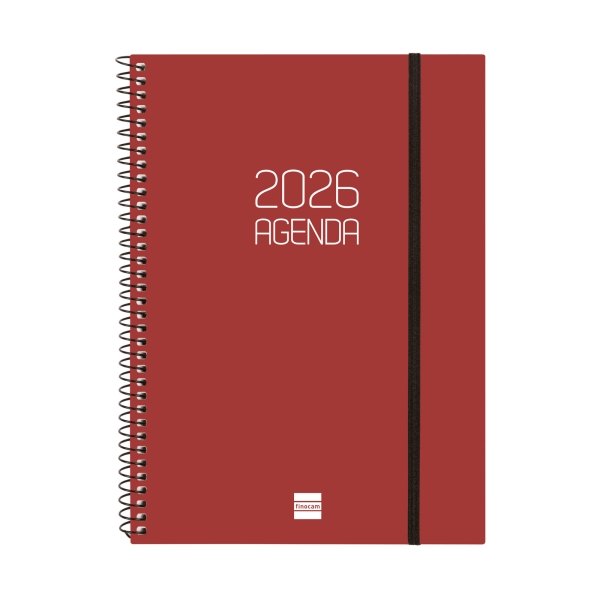 Finocam Opaque Agenda de Espiral – Anual 2026 – Tapa Ligera – Cierre con Goma Elastica – Formato E10 – 162x14x212mm – Semana Vista Horizontal – Color Burdeos