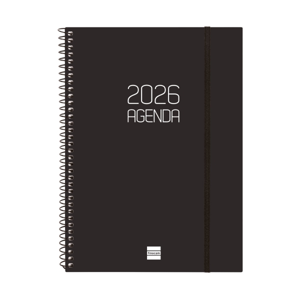 Finocam Opaque Agenda de Espiral – Anual 2026 – Tapa Ligera – Cierre con Goma Elastica – Formato E10 – 162x14x212mm – Semana Vista Horizontal – Color Negro
