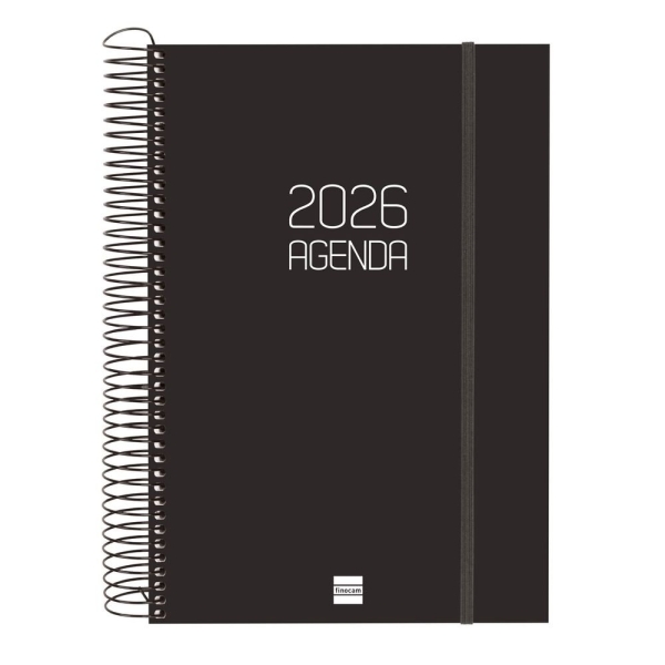 Finocam Opaque Agenda de Espiral – Anual 2026 – Tapa Ligera – Cierre con Goma Elastica – Formato E11 – 1 Dia por Pagina – Color Negro