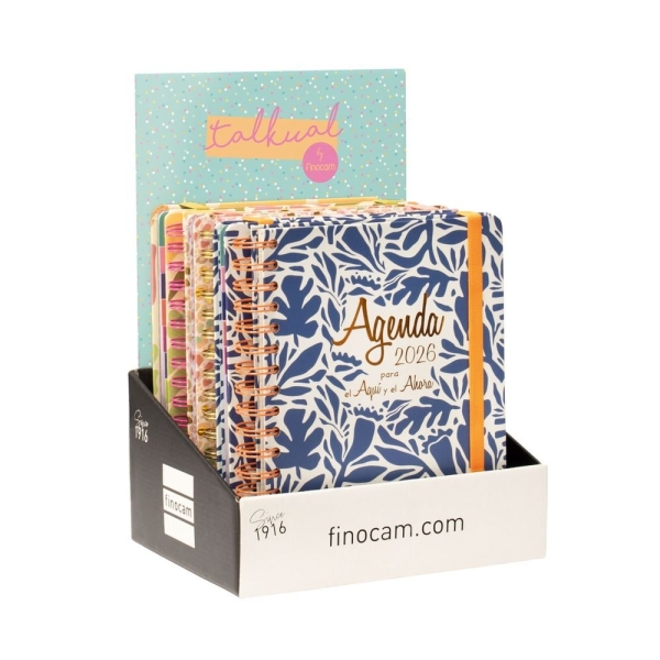 Finocam Talkual Expositor con 14 Agendas de Espiral Surtidas – Anual 2026 – Tapa Dura – Cierre de Goma – Color Surtidos