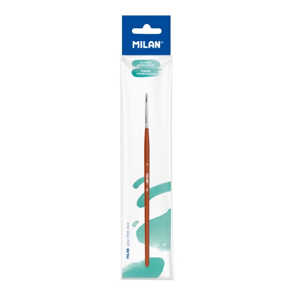 Pincel escolar redondo de la serie 101. tamaño nº 0. de la marca Milan, con mango de madera barnizada y virola de aluminio.