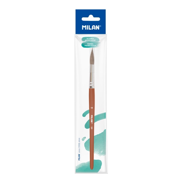 Es un pincel escolar redondo de la serie 101. número 14. de la marca Milan, con mango de madera barnizada y pelo de cabra y sintético adecuado para acuarela y témpera.