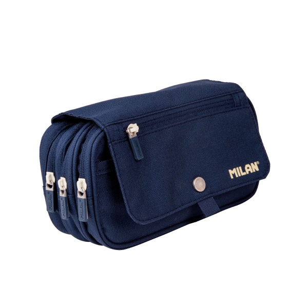 Estuche portatodo de gran capacidad con 3 bolsillos con cremallera y un pequeño bolsillo frontal en la solapa. Cierre de botón a presión. Colección 430 since 1918, inspirada en los colores y diseño originales de las gomas de borrar MILAN, fabricadas en España desde 1918.
