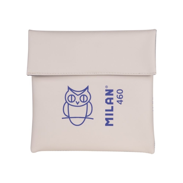 Bolsa isotérmica porta alimentos pequeña tipo sobre. Color beige con estampado de buhos en color azul marino. Colección 460 since 1918, inspirada en los colores y diseño originales de las gomas de borrar MILAN, fabricadas en España desde 1918.