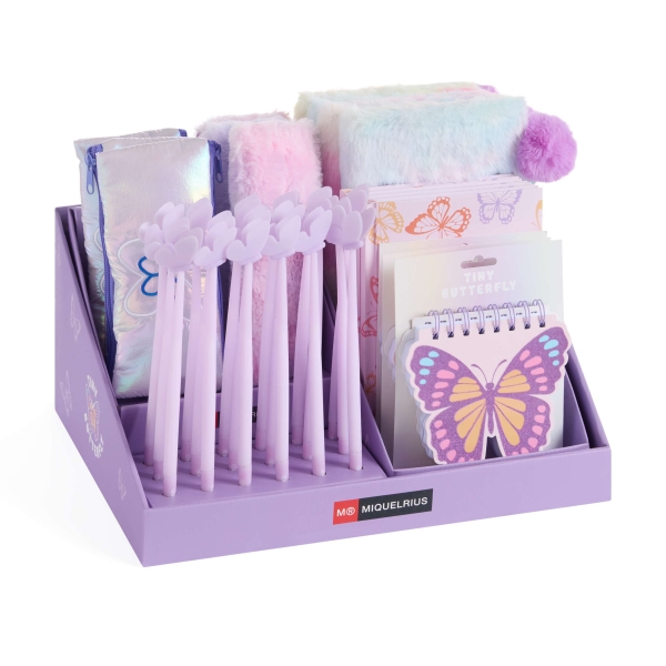 Miquel Rius Butterfly Expositor Multiproducto con 38 Piezas Surtidas de Cuadernos y Diarios, Portatodos y Boligrafos